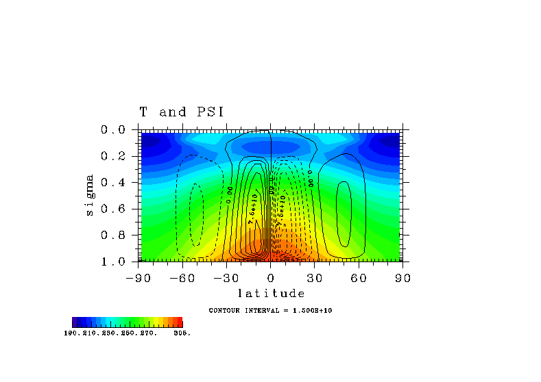 温度 + (u, -SigDot) の (x,z) 断面 at 赤道