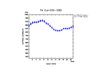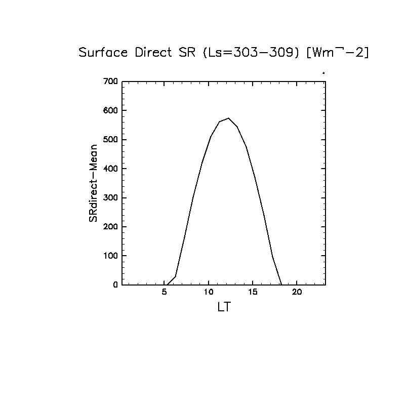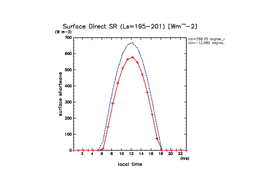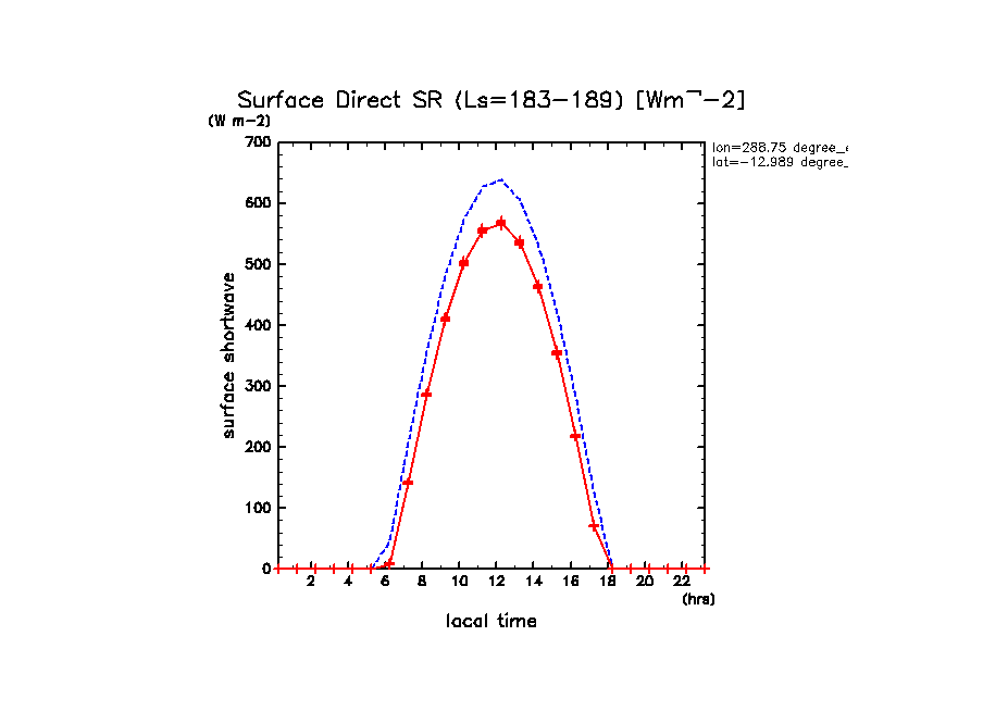 地表における直達太陽放射 (下向きを正, 実線は平均, 破線は大気上端)