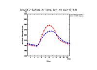 地表面温度(赤)と地表気温(青: z=1m の換算値) (実線は平均)