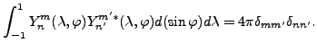 $\displaystyle = \frac{I}{2} \int_{-1}^{1} f_{n'}^{m} P_{n}^{m}(\varphi) \DD{P_{n'}^m}{\varphi} d \varphi \delta_{m m'} .$