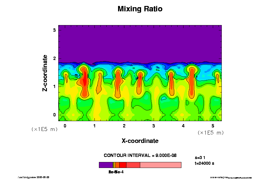 - この計算では, 基本的に熱源が存在しない. Nakajima et al (2000) で設定した「下部境界で温度一定」は考慮していない.