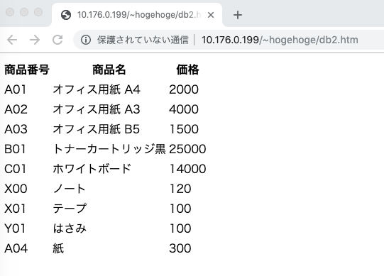 $ ruby db2-3.rb <html> <meta http-equiv="Content-Type" content="text/html; charset=UTF-8"> <body> <table><tr><th>商品番号</th><th>商品名</th><th>価格</th></tr> <tr><td>A01</td><td>オフィス用紙 A4</td><td>2000</td></tr> <tr><td>A02</td><td>オフィス用紙 A3</td><td>4000</td></tr> <tr><td>A03</td><td>オフィス用紙 B5</td><td>1500</td></tr> <tr><td>B01</td><td>トナーカートリッジ黒</td><td>25000</td></tr> <tr><td>C01</td><td>ホワイトボード</td><td>14000</td></tr> <tr><td>X00</td><td>ノート</td><td>120</td></tr> <tr><td>X01</td><td>テープ</td><td>100</td></tr> <tr><td>Y01</td><td>はさみ</td><td>100</td></tr> <tr><td>A04</td><td>紙</td><td>300</td></tr> </table> </body></html>
