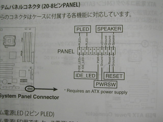 前面パネルのパワーボタン, リセットボタン, IDE ランプ, パワーランプ, スピーカーを有効にするため, コネクタをマザーボードにつなぎます. 取説を参照しましょう.