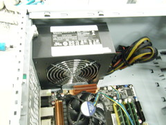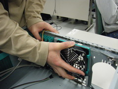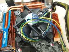 CPUが適切に取り付けられていることが確認できたら, 組み立て作業に戻ります. M/Bおよび電源の電源を落としてから, 電源ケーブルとグラフィックボードを取り外してください. 次に筐体背面のファンをスライドさせて取り外します. |