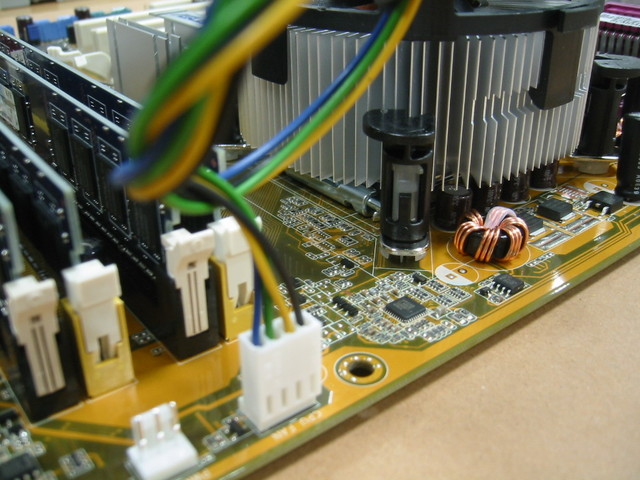 CPU ファンの電源ケーブルがマザーボード側の CPU ファン用電源コネクタにすぐさせるような向きで.