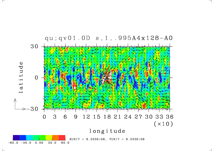東西風鉛直風偏差ベクトル(m/s)(σ=0.995). 鉛直風はデータ自体を 2^22 倍している.
