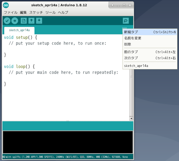 右上の ▼ アイコンを押せば, タブとして新たなファイルが追加される. 新たなタブのファイル名に拡張子を付けずに保存すると, 拡張子は .ino となる. .ino の場合には, #include は特に必要無い. .ino 同士は一緒にコンパイルされる.