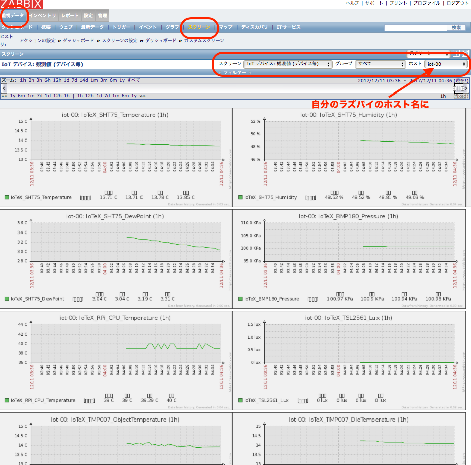 - [監視データ] => [スクリーン] => IoT デバイス : 状態監視 (デバイス毎) => ホスト : <自分のラズパイのホスト名>