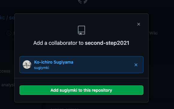 承諾すると A さんのリポジトリが自動で Web ブラウザ上に表示される. 上部に "You now have push access to the sugiymkc/second-step2021 repository." と書かれていることに気づくことだろう.