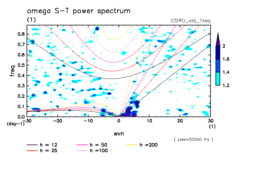 << Aqua Planet: Wheeler and Kiladis (1999) Plot from '1keq' Experiment >> group: CSIRO (Commonwealth Scientific and Industrial Research Organization, Aspendale, Victoria, Australia) model: CSIRO conformal-cubic model (CCAM-05a, old)