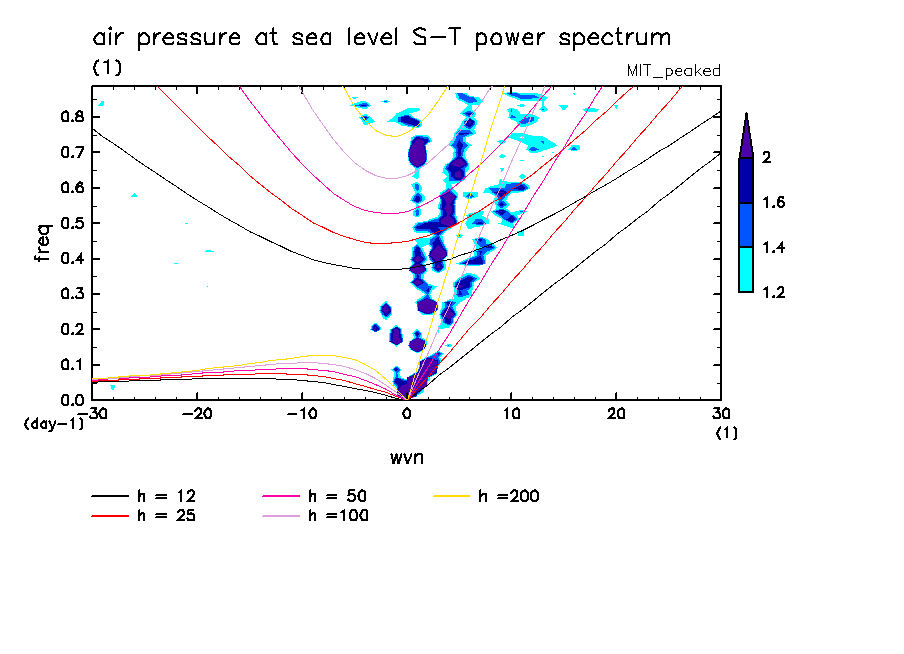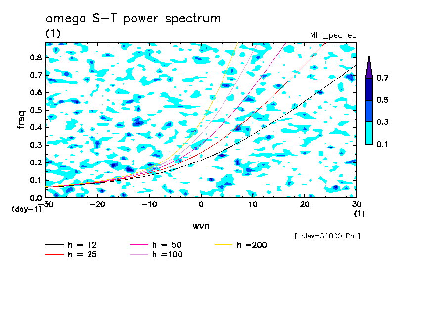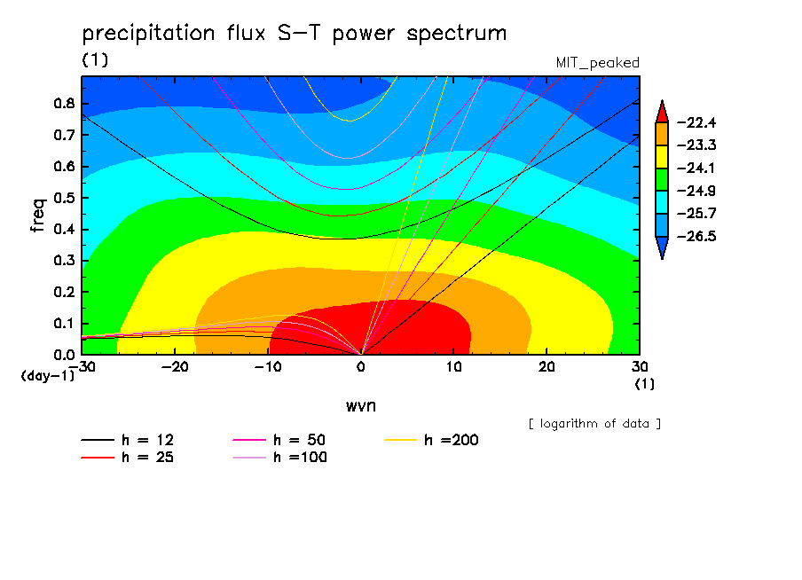<< Aqua Planet: Wheeler and Kiladis (1999) Plot from 'peaked' Experiment >> group: MIT (Massachusetts Institute of Technology, Cambridge, MA, USA) model: MIT-GCM