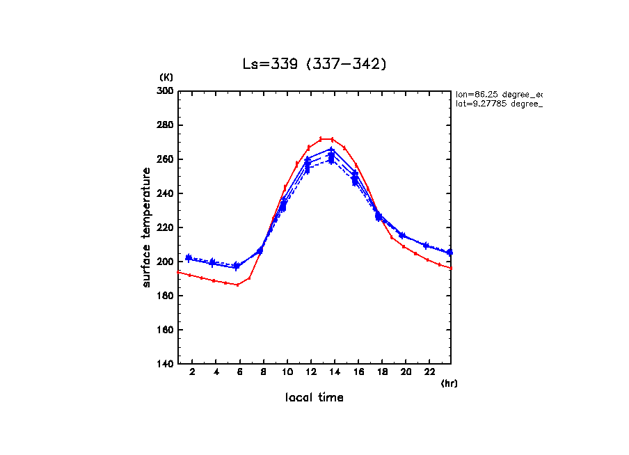 Isidis Planitia の緯度経度は (10.5N, 85.5E) であるが, その緯度経度に モデルの格子点が存在するわけではない. 近傍の場所でのデータをプロットしていることに注意.