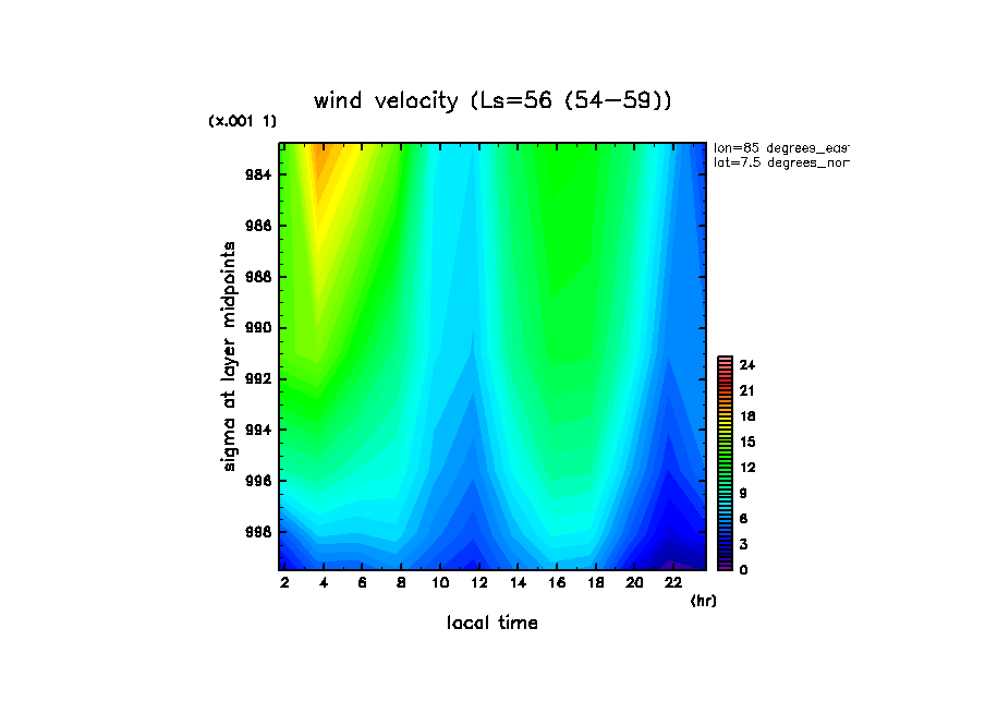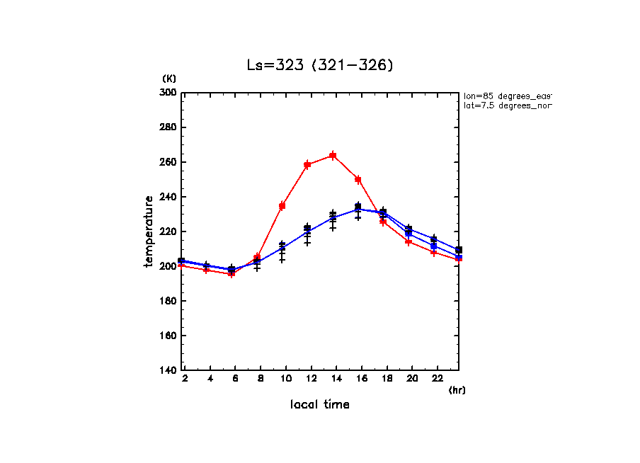 Isidis Planitia の緯度経度は (10.5N, 85.5E) であるが, その緯度経 度にモデルの格子点が存在するわけではない. 近傍の場所 (7.5N, 85E) でのデータをプロットしていることに注意.