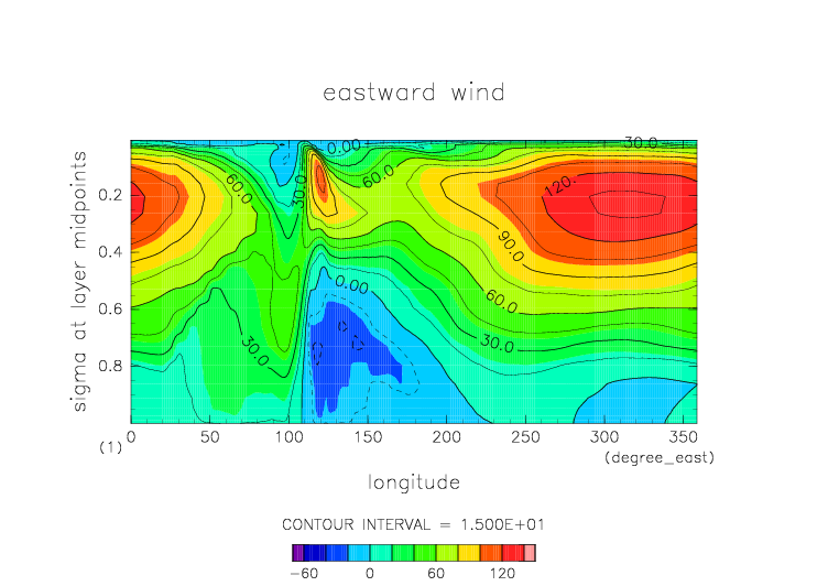 東西風. 赤道断面 (鉛直座標は対数プロット)