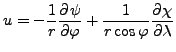 $\displaystyle v$ $\displaystyle = \frac{1}{r\cos\varphi} \DP{\psi}{\lambda} + \frac{1}{r} \DP{\chi}{\varphi}$ (A.34)