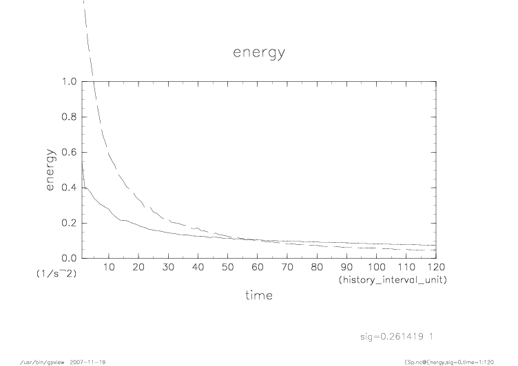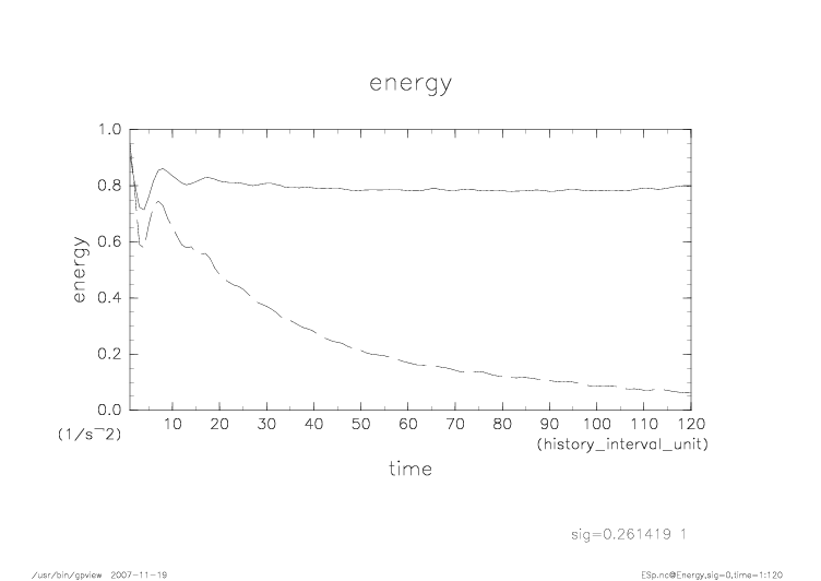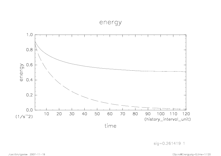 上層、下層の運動エネルギーの時間発展。 実線が上層、破線が下層を示す。