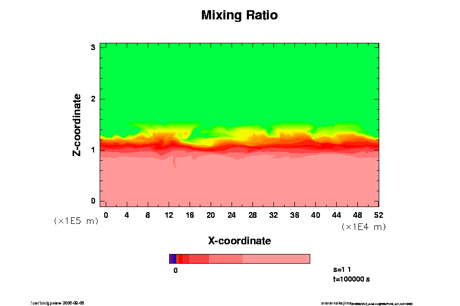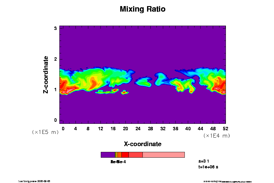 Nakajima et al (2000) の設定を従い, 木星大気での雲対流をシミュレートする. 凝縮成分は H2O のみ考慮し, 基本場の H2O 混合比の湿度は 100 km 付近より上空で 75% とする. 雲の併合成長過程として, Kessler (1969) を用いる. 但し, 閾値をゼロとし, 時間スケールを 100 秒とする.