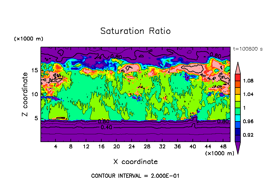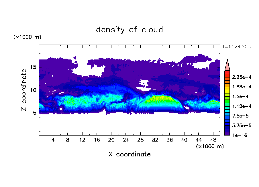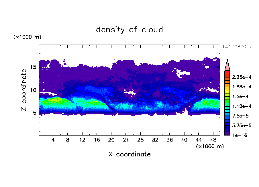 雲粒の落下・雲粒の荷重効果を考慮し, 水平 50 km, 鉛直 20 km の領域で計算を行なった.