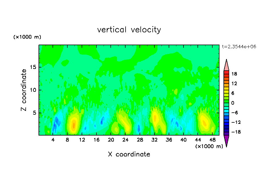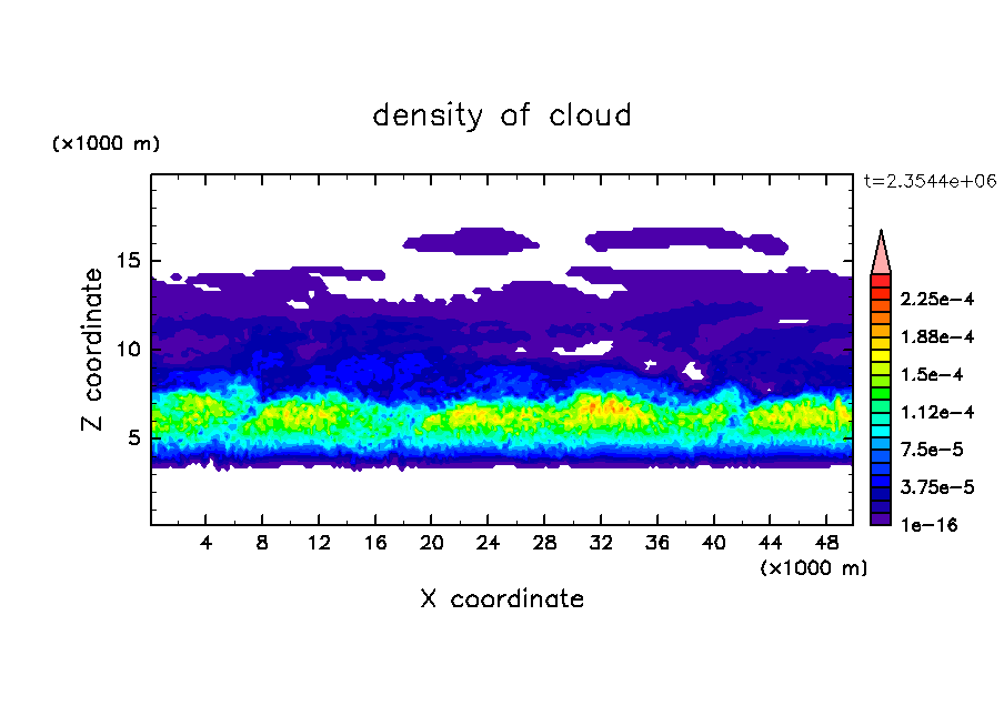 雲粒の落下・雲粒の荷重効果を考慮し, 水平 50 km, 鉛直 20 km の領域で計算を行なった. 高度 15 km より上にスポンジ層を導入し, 最下層で拡散型の熱フラックスを与えた. 計算コストを下げる為, 雲粒落下速度において, 粘性係数・平均自由行程は基本場の量で評価した.