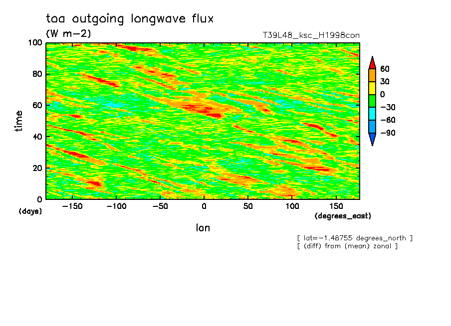 << Aqua Planet: Takayabu (1994), Wheeler and Kiladis (1999) Plot from 'H1998con' Experiment >> resolution: T39L48, cumulus parameterization: Kuo + shallow convection scheme, Original data produced: 2004/05 on ES.