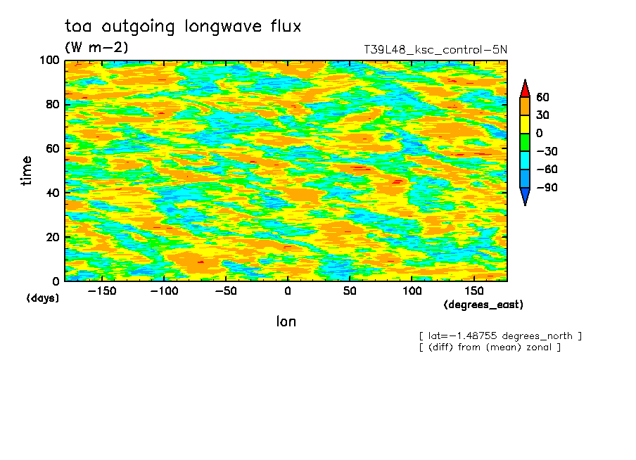 << Aqua Planet: Takayabu (1994), Wheeler and Kiladis (1999) Plot from 'control-5N' Experiment >> resolution: T39L48, cumulus parameterization: Kuo + shallow convection scheme, Original data produced: 2004/05 on ES.