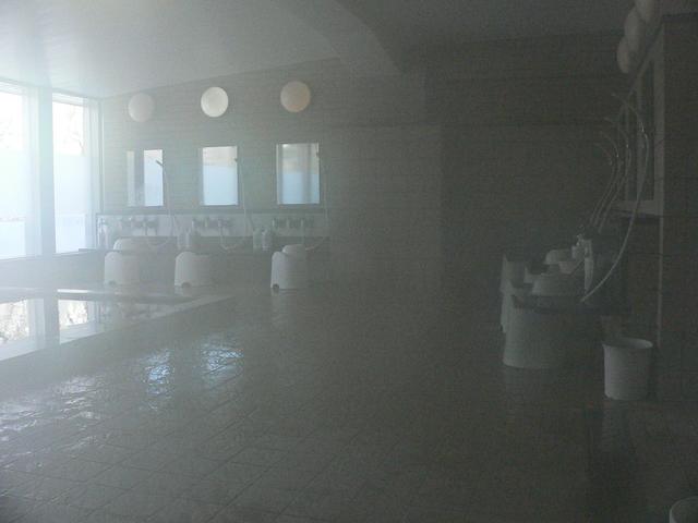 温泉. 湯船 1 つ. 洗い場が 8 つ. 奥にサウナ有.
